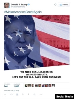 На фотографии изображен американский флаг, на фоне которого расположены стодолларовые банкноты, Белый дом, сам Трамп и военные. К записи был прикреплен хэштег "верните Америке былую славу".