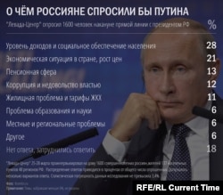 Кремль сообщает, что президенту поступило более миллиона вопросов, и, как подчеркивает пресс-секретарь Путина Дмитрий Песков, большинство из них касаются социально-экономической тематики.