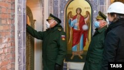 В парке "Патриот" неподалеку от подмосковной Кубинки завершается возведение главного храма Вооруженных сил России. По данным "МБХ Медиа", его украсят изображения серпа и молота, портрет Сталина, панно с групповым портретом министра обороны Сергея Шойгу, президента России Владимира Путина, Валентины Матвиенко, байкера Хирурга и других. Среди витражей – орден Великой Отечественной войны, на мозаике – посвящение аннексии Крыма.