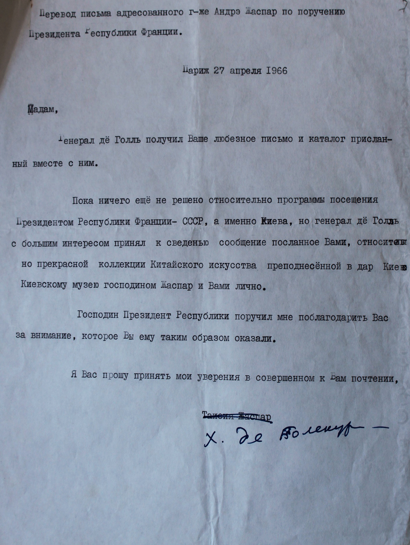 Председатель КГБ писал: Таисия не только знает быт, обычаи и привычки Де Голля и его семьи, но и в последние месяцы переписывалась с ним. Сначала Жаспар отправила президенту Франции свою недавно вышедшую книжку и объяснила, что это подарок для его внуков. В следующих письмах она напомнила о покойном муже, рассказала историю китайской коллекции (к письму прилагался каталог) и предложила осмотреть ее во время предстоящего визита в Киев.