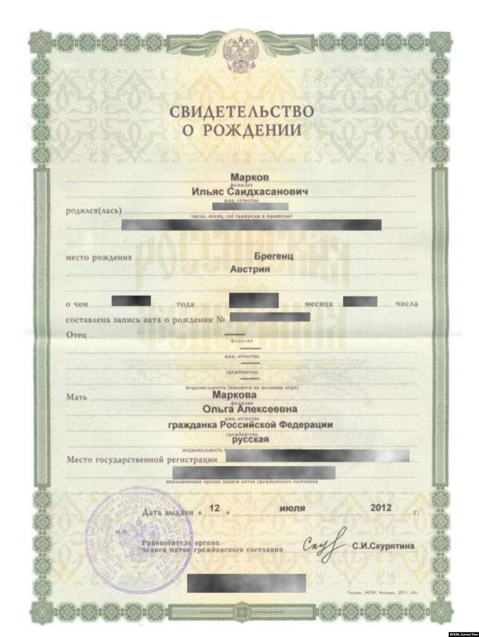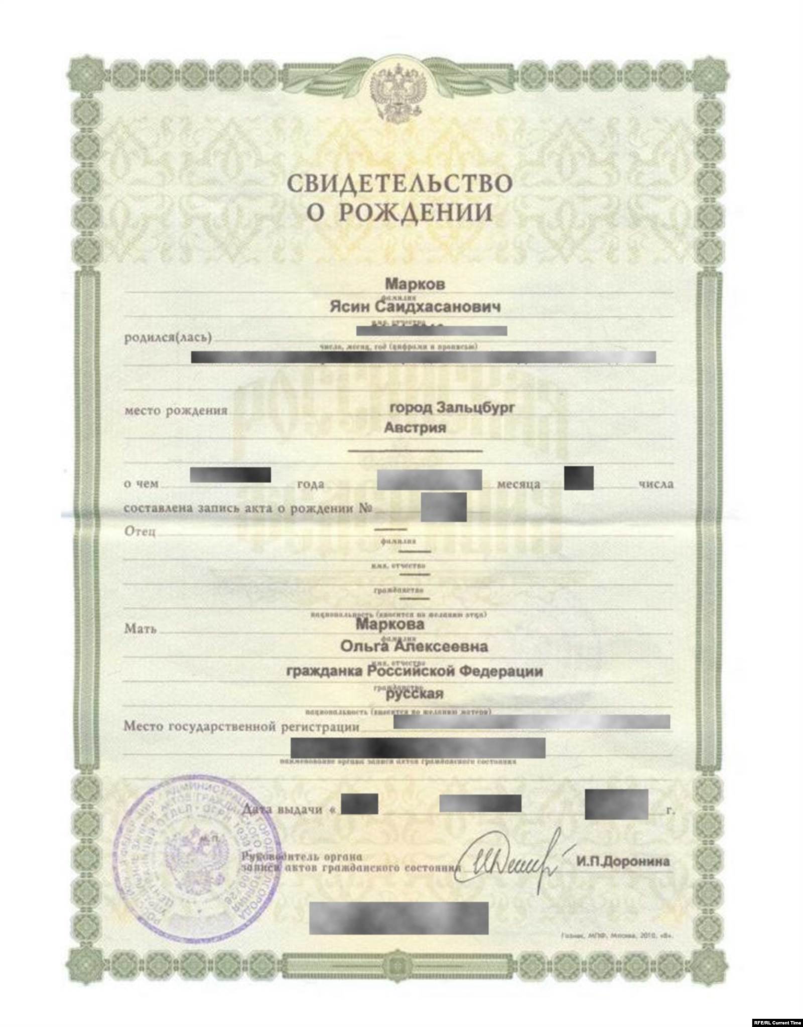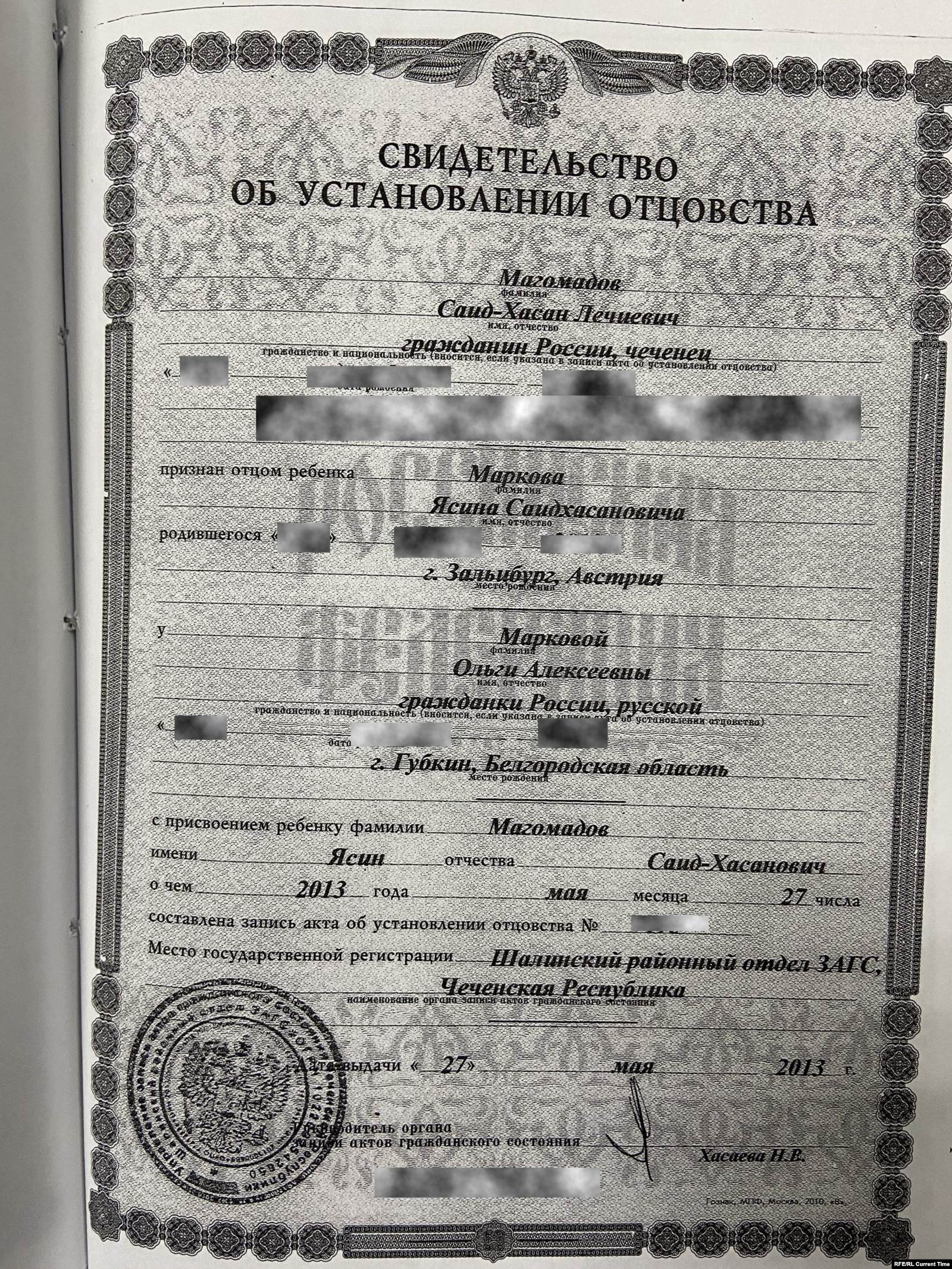 Магомадов значится отцом детей в австрийских свидетельствах о рождении, они в этом документе записаны на его фамилию. Когда же Ольга решила в Австрии сделать детям российское гражданство, то Саид-Хасан отказался заходить в посольство, поскольку официально имел статус беженца, и ему нельзя было появляться на территории Российской Федерации. Оформляя детям российское гражданство, Ольга записала их на свою фамилию. В российских свидетельствах о рождении детей она – единственный их родитель, в графе отец стоит прочерк. Но в Чечне он, говорит Ольга, подделал документ о признании отцовства.