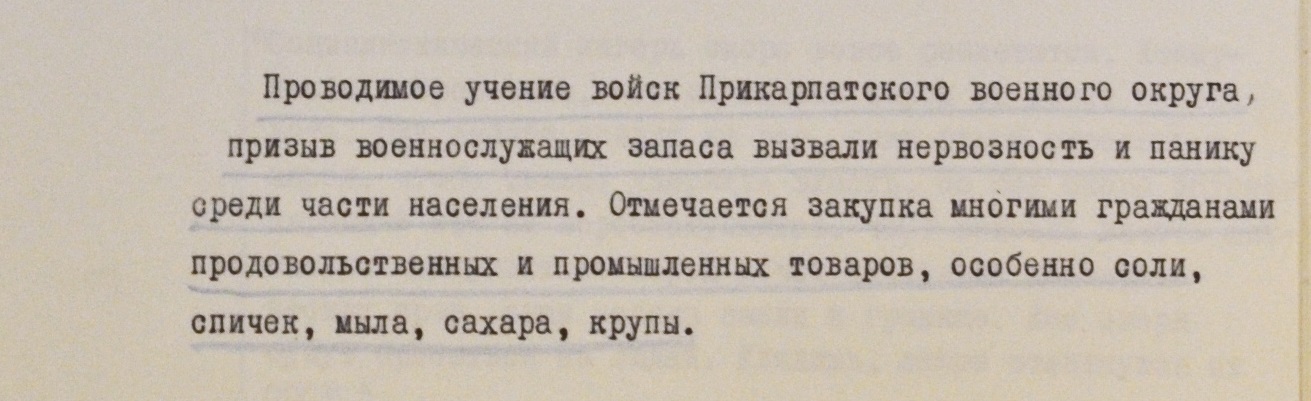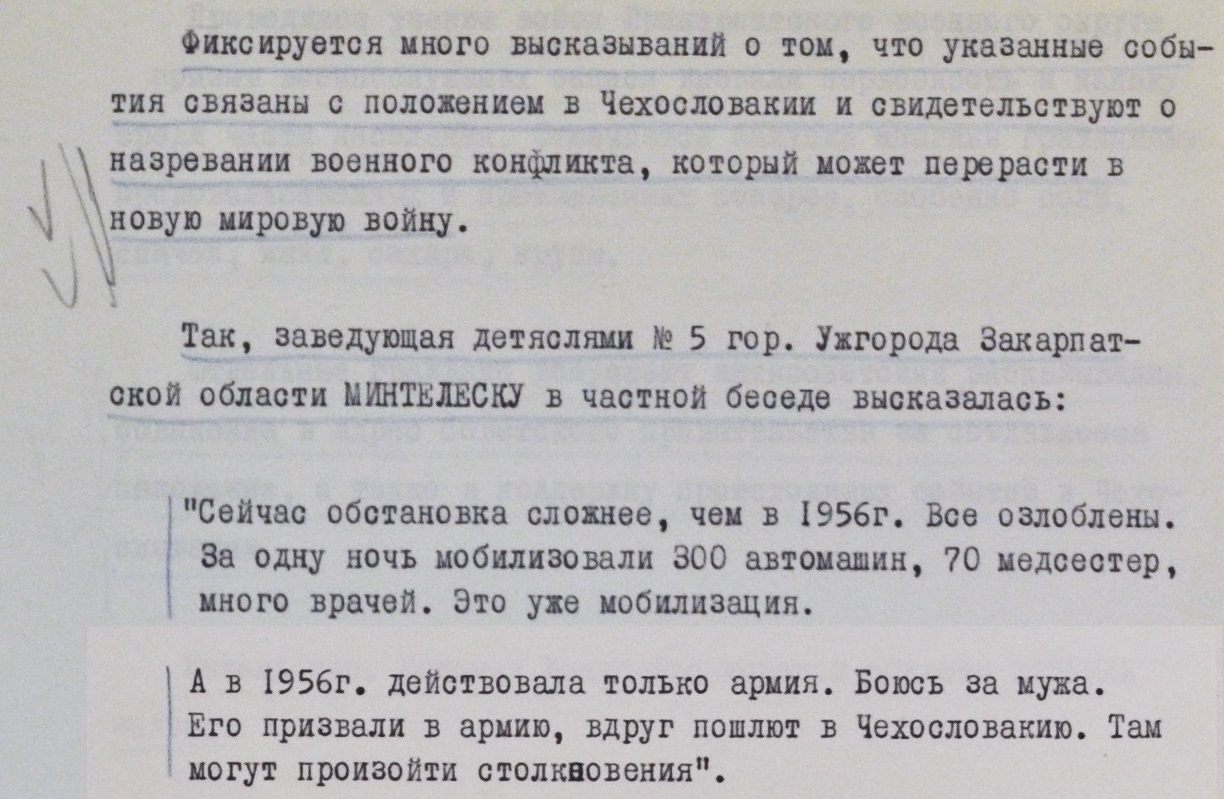 “Боюсь за мужа. Его призвали в армию, вдруг пошлют в Чехословакию. Там могут произойти столкновения”, – фиксировал КГБ высказывание заведующей яслями из Ужгорода по фамилии Минтелеску в июле 1968 года.