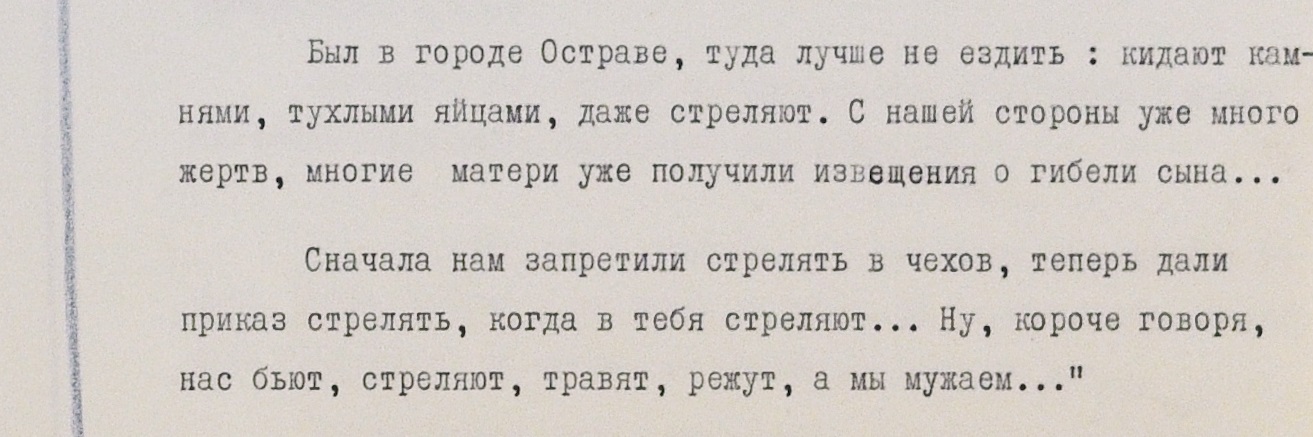 По его же словам, особенно тяжело приходится в Остраве (промышленный город на востоке Чехии – НВ): там в ход идут камни, тухлые яйца и даже пули. Он упоминает о множестве жертв с советской стороны.