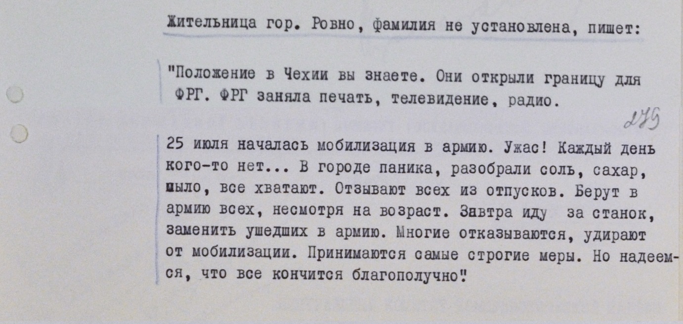 “25 июля началась мобилизация в армию. Ужас! Каждый день кого-то нет… В городе паника, разобрали соль, сахар, мыло, все хватают. Отзывают всех из отпусков. Берут в армию всех, несмотря на возраст. Завтра иду за станок, заменить ушедших в армию. Многие отказываются, удирают от мобилизации. Принимаются самые строгие меры”, – так жительница Ровно в письме описывала ситуацию в своем городе.