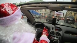 Рядом с дедом – Снегурочка. Водители проезжающих мимо машин сигналят, а на светофоре водитель троллейбуса не обращает внимания на переключившийся зеленый сигнал и, как завороженный, достает мобильный телефон – снимает удивительный транспорт.