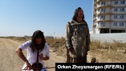 Пока шаман Ахмедияров разворачивал грузовые машины у въезда на пустошь, на другой ее части художница Айгерим Оспан вооружилась музыкальным инструментом – кобызом. Она пыталась коснуться "струн души" машиниста ковшового трактора.
