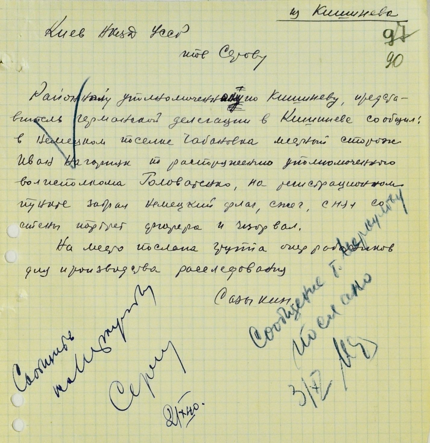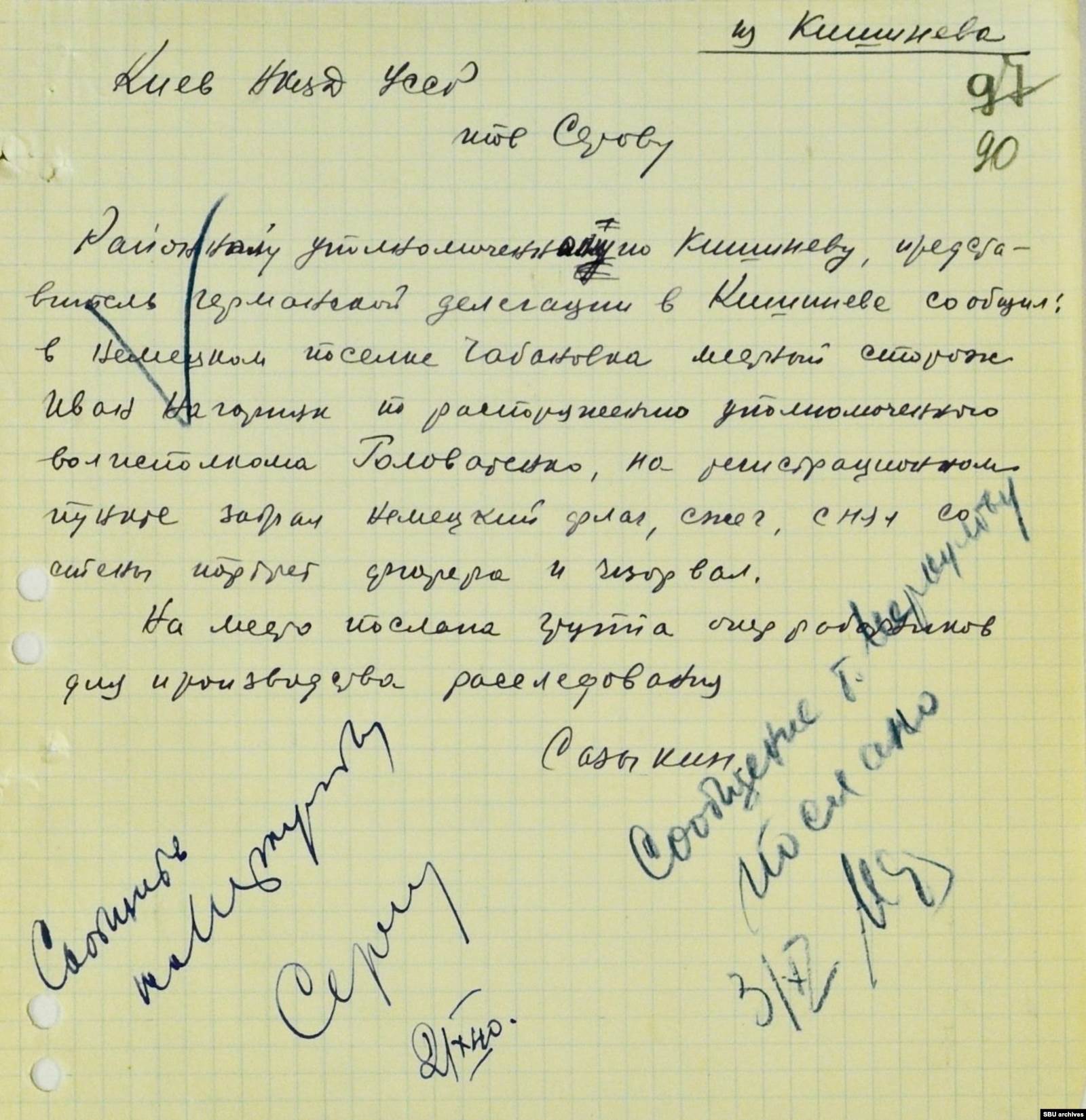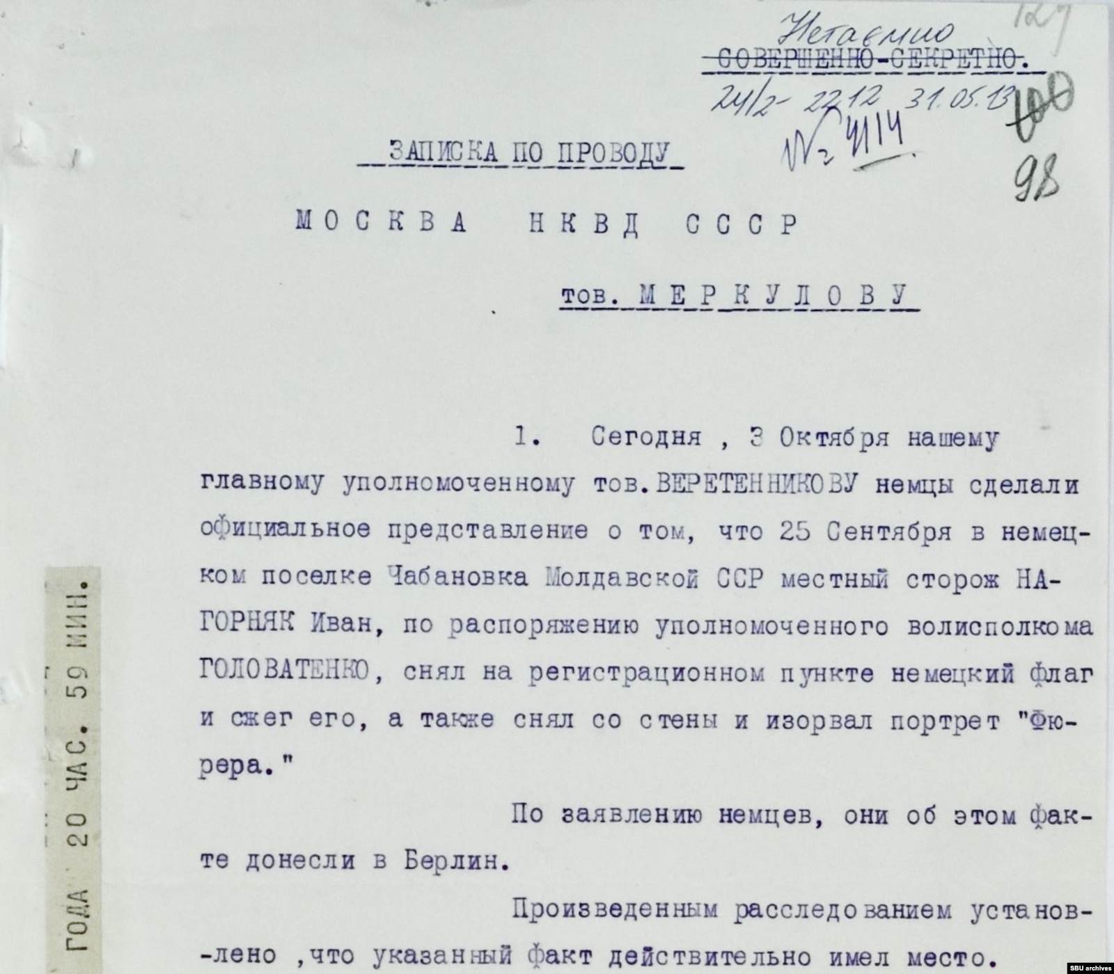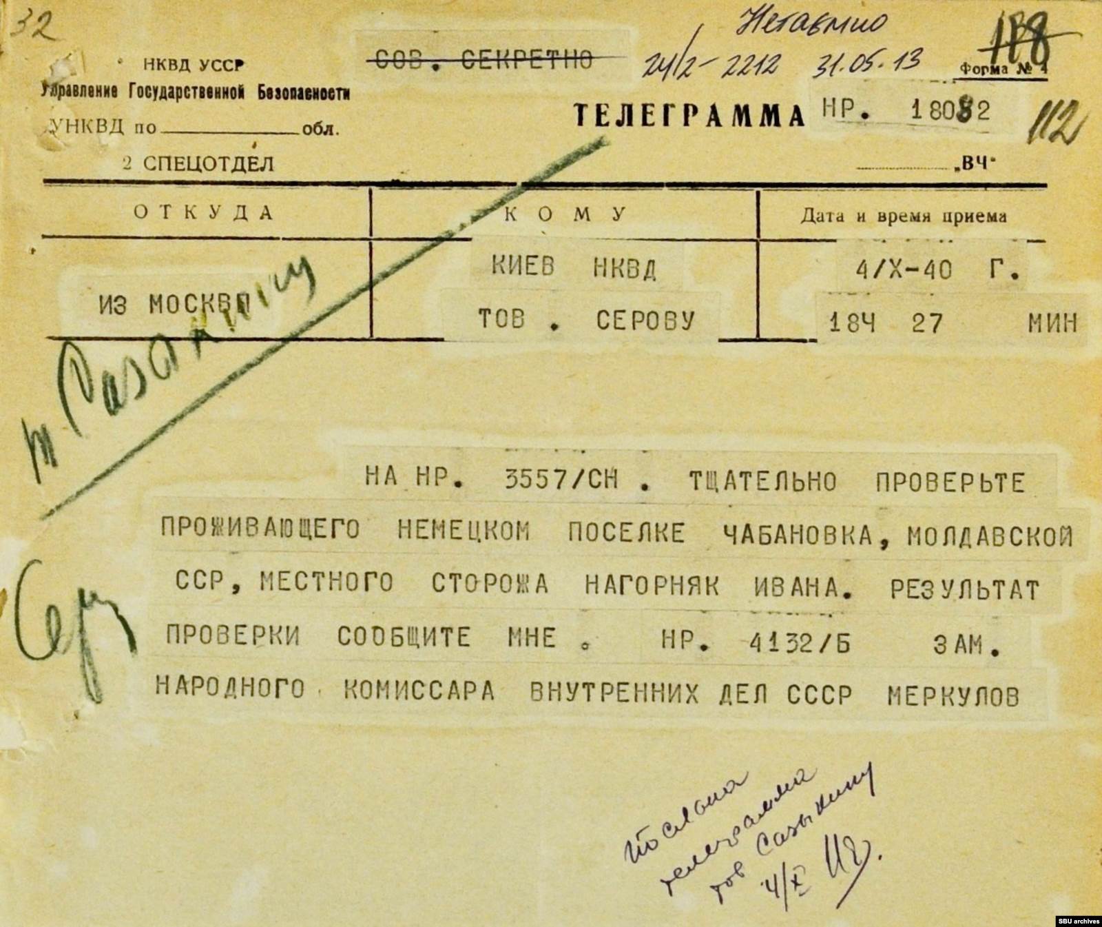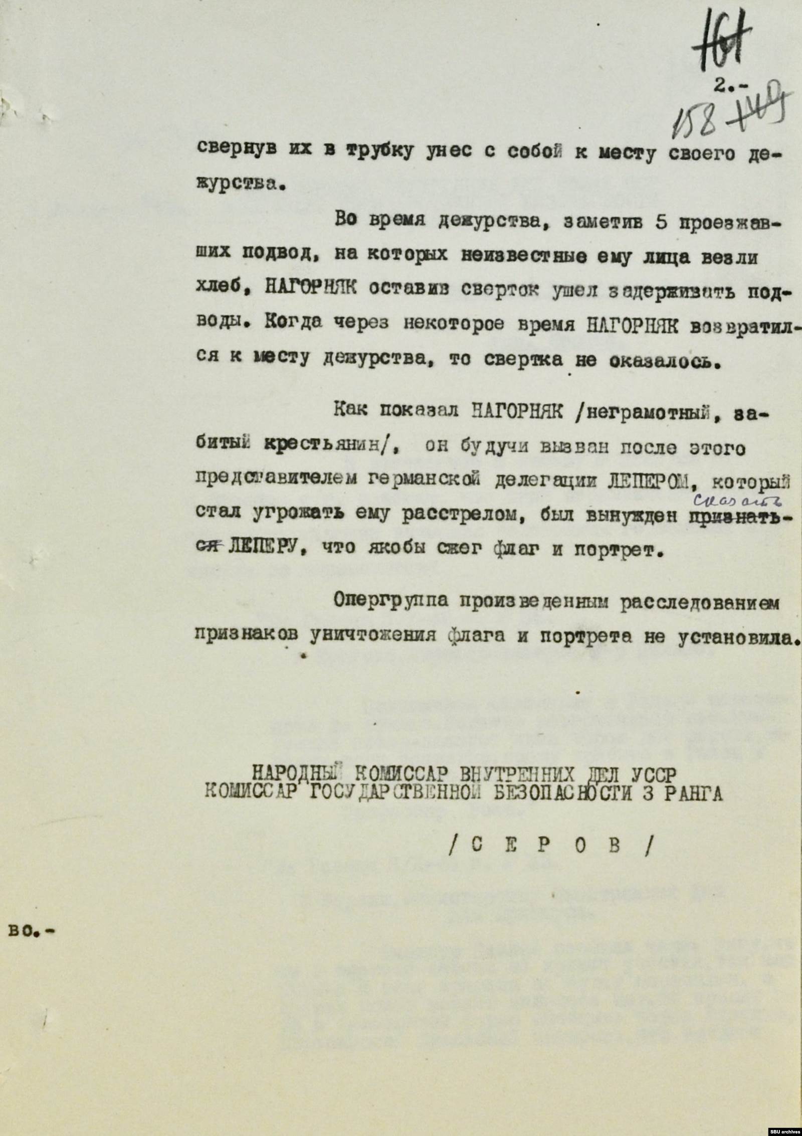 Как именно все случилось — почему сторож посягнул на нацистские символы и кого наказывать — в НКВД пока не понимали. На место отправили группу оперативников. История успела дойти не только до киевских, но и до московских кабинетов — глава НКВД Украины, узнав о случившемся, на следующий день доложил первому заместителю наркома внутренних дел СССР Всеволоду Меркулову. Тот в ответ приказал «тщательно проверить» Ивана Нагорняка и доложить о результатах.