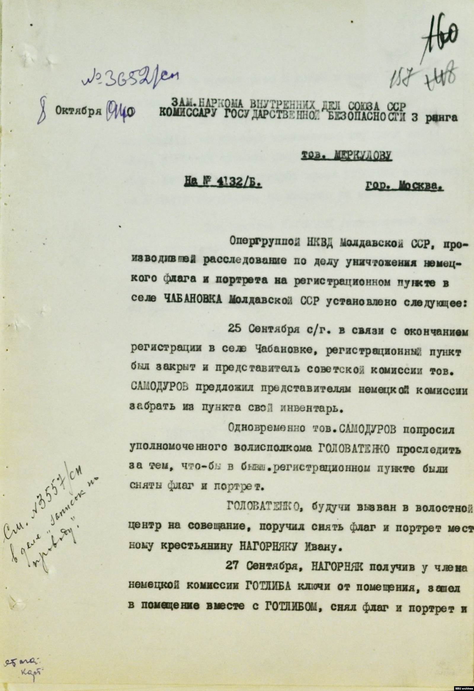 В начале октября 1940 года из Кишинева в Киев пришло сообщение о чрезвычайном происшествии в молдавском селе Чабановка*. Утверждалось, что местный сторож Иван Нагорняк «на регистрационном пункте забрал немецкий флаг, сжег, снял со стены портрет фюрера и изорвал».