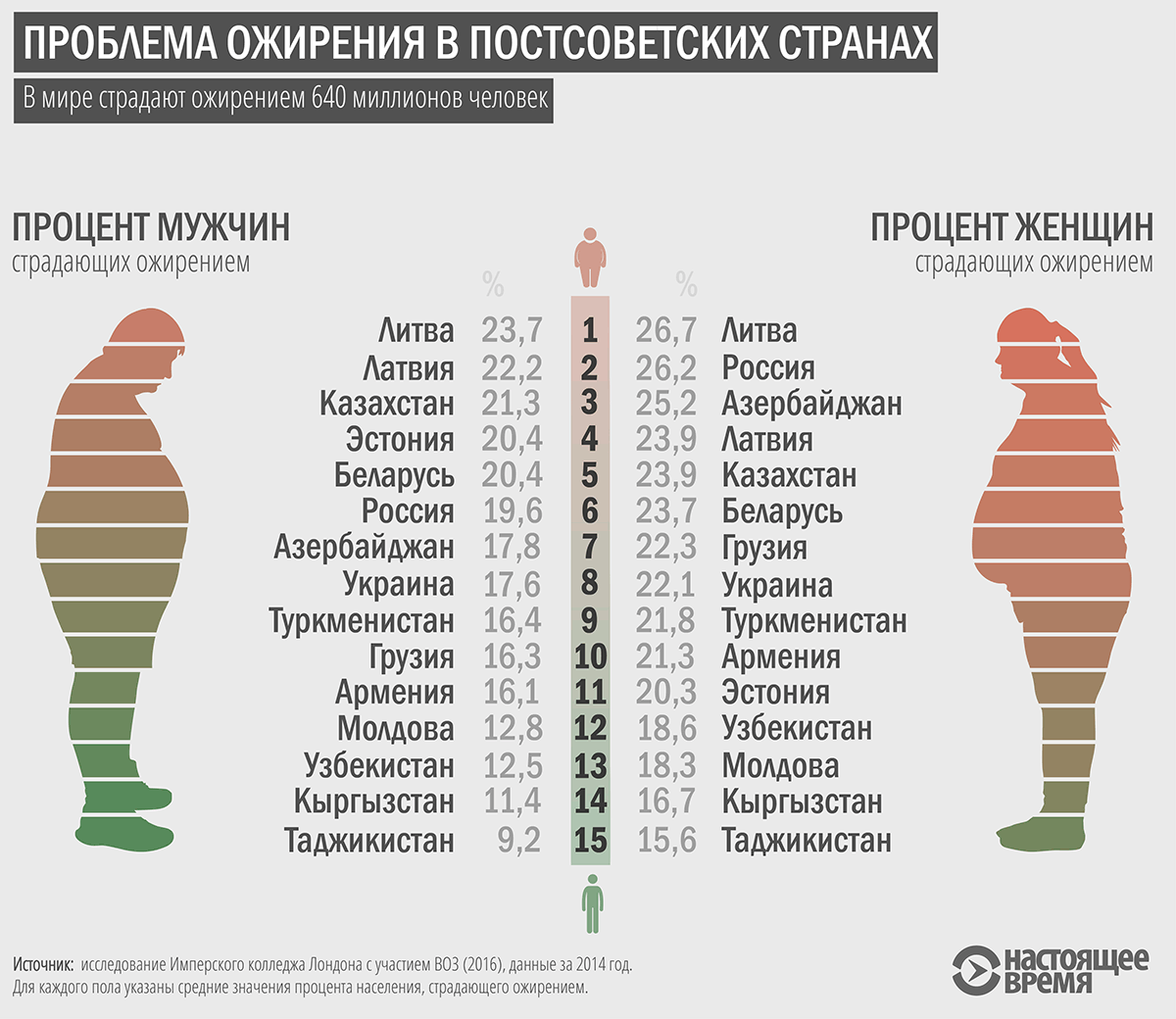 Для каждого пола и каждой страны указаны средние значения процента населения, страдающего ожирением.