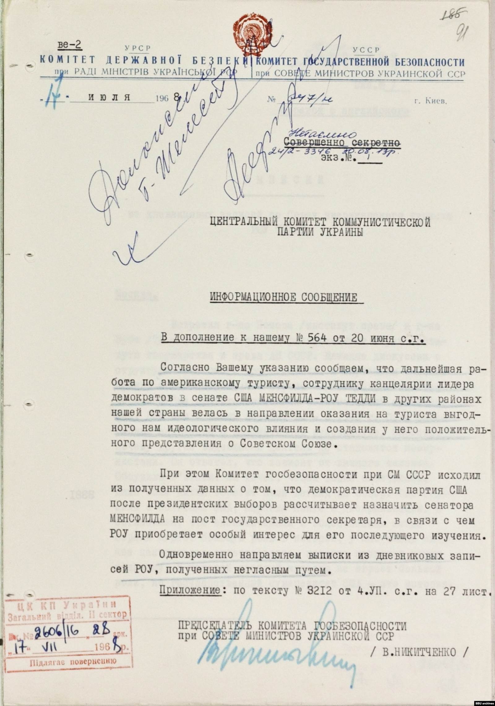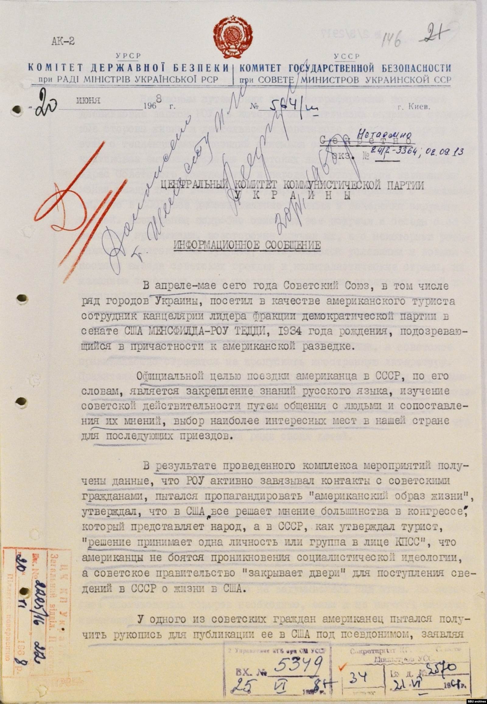 "В апреле-мае сего [1968] года Советский Союз, в том числе ряд городов Украины, посетил в качестве американского туриста сотрудник канцелярии лидера фракции демократической партии в сенате США Менсфилда — Роу Тедди, 1934 года рождения, подозревающийся в причастности к американской разведке.