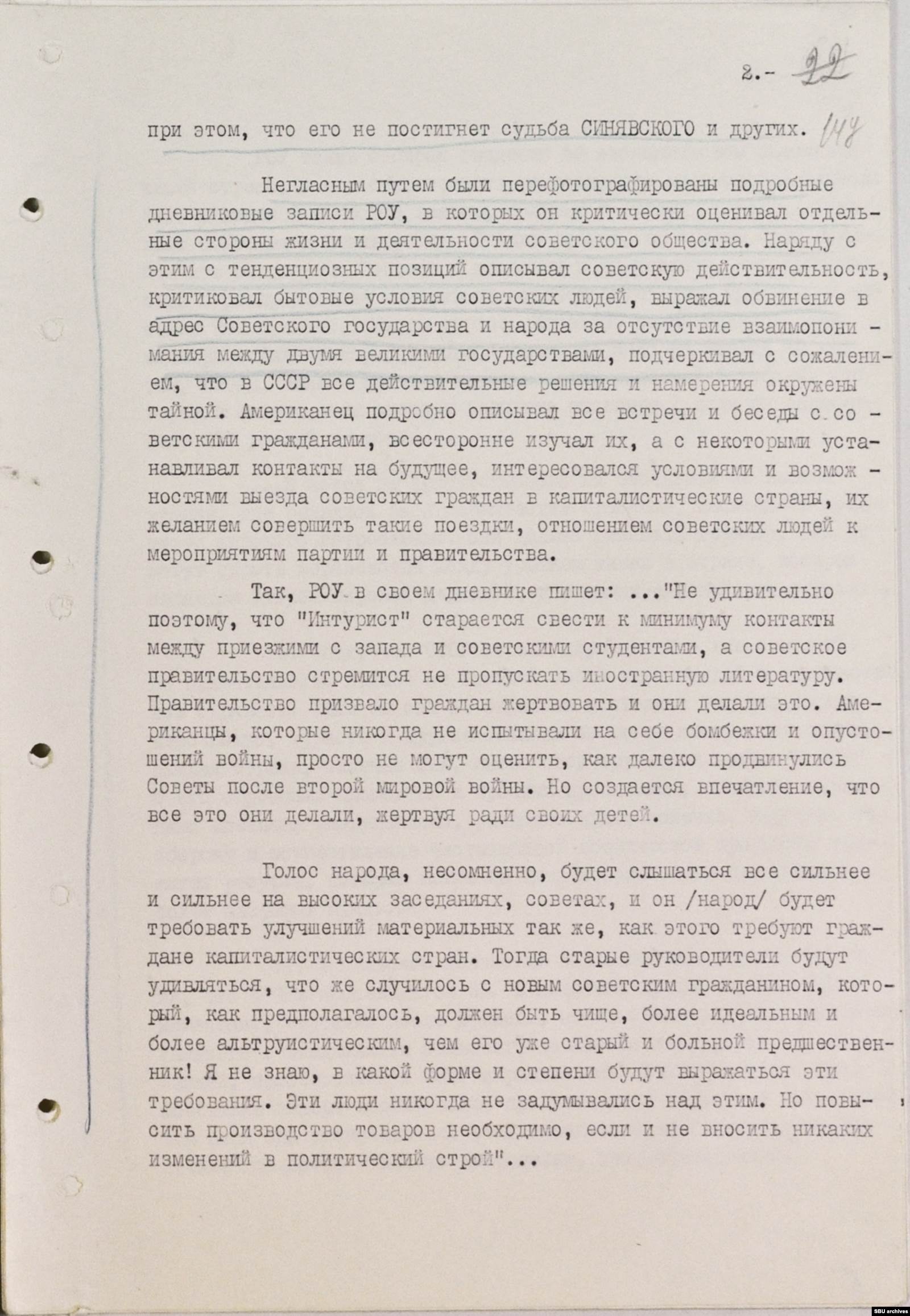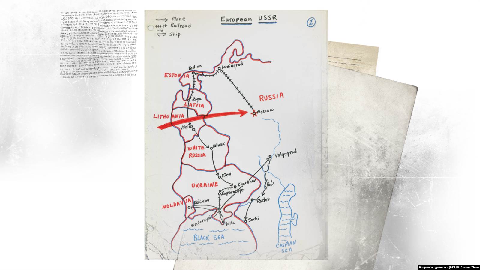 В тех же документах сотрудники органов отчитываются: "Негласным путем были перефотографированы подробные дневниковые записи Роу, в которых он критически оценивал отдельные стороны жизни и деятельности советского общества". К этому сообщению КГБ прилагаются обширные переведенные на русский цитаты из дневника туриста. Это 27 машинописных страниц, примерно месяц в дороге (треть всей поездки) по маршруту Москва – Ленинград – Таллинн – Рига – Вильнюс – Минск – Киев – Харьков – Запорожье – Ялта. Чекисты выбрали для партийного руководства лишь те фрагменты, которые каким-то образом касались политики или содержали оценки советских реалий.