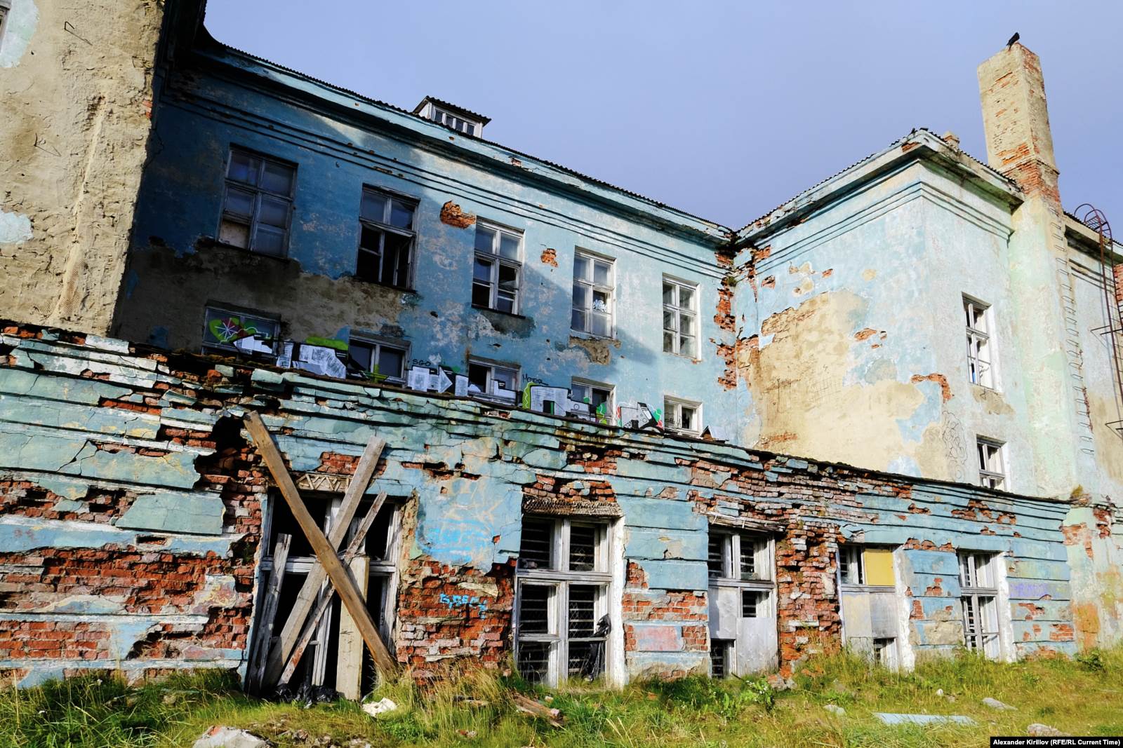 Игорь показывает на заброшенное деревянное жилое здание. Оно ярко-синего цвета: «Его покрасили перед съемками. Раньше оно было зеленым, но, видимо, тот цвет не подходил по сценарию». Покрасили только главный фасад. Со стороны двора здание покрыто старой зеленой краской, значительная часть которой уже облупилась.